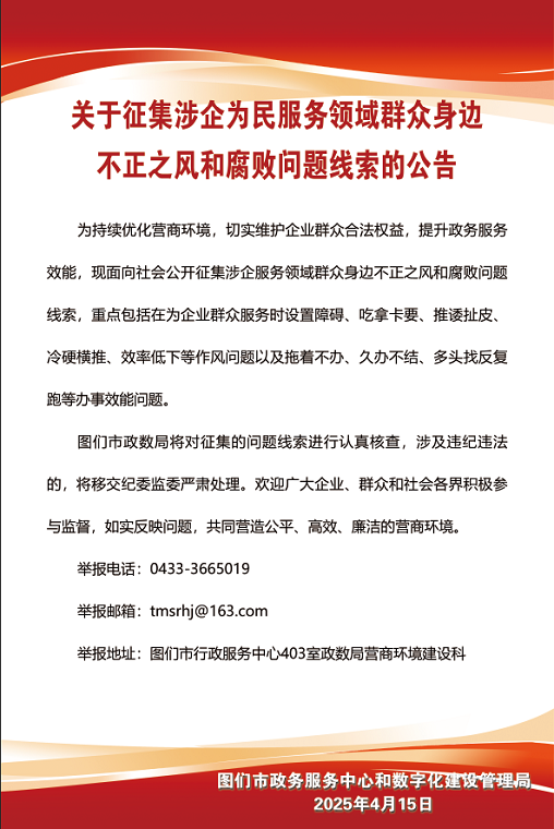 關于征集涉企為民服務領域群眾身邊不正之風和腐敗問題線索的公告